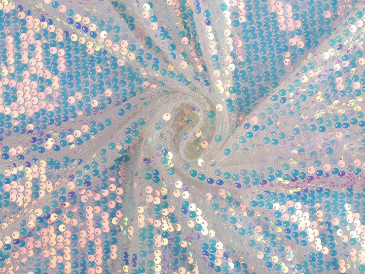 Sateenkaaren väreissä kimalteleva paljettikangas. Kankaan pohjana on vaalea pehmeä meshtylli.