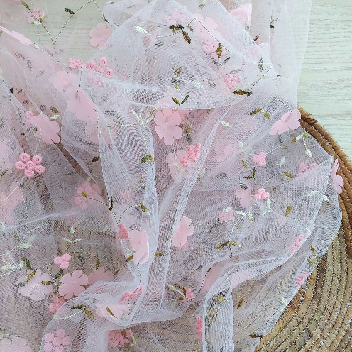Roosan värinen pehmeä tylli persikkaisen värisillä brodeeratuilla kukilla. Osa kukista on brodeerattu ja osan terälehdet ovat irtonaiset. Kukkien halkaisija on n. 3 cm. Tällä meshtyyppisellä laskeutuvalla tyllillä ompelet niin tyllihameet, kuin ihanan kevyet kesäiset mekot ja paidat.
