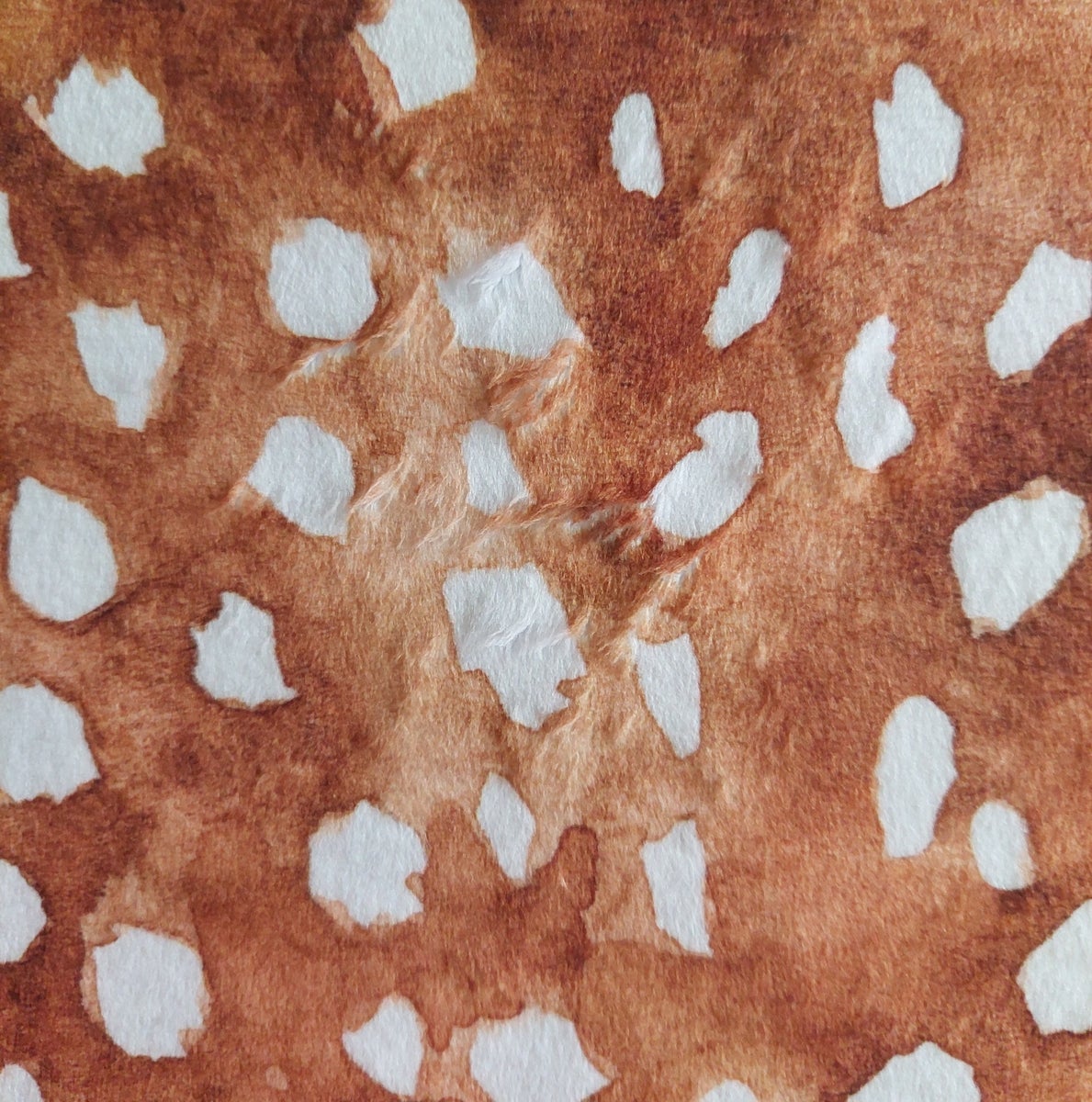 Ruskea bambin pilkut kuosi lyhytkarvaisena kankaana. Tämä suloinen ja pehmoinen kangas on kuin eläimen turkki. Karvaa voi silitellä kumpaankin suuntaan. Kuvassa kangasta on silitetty vastakarvaan.