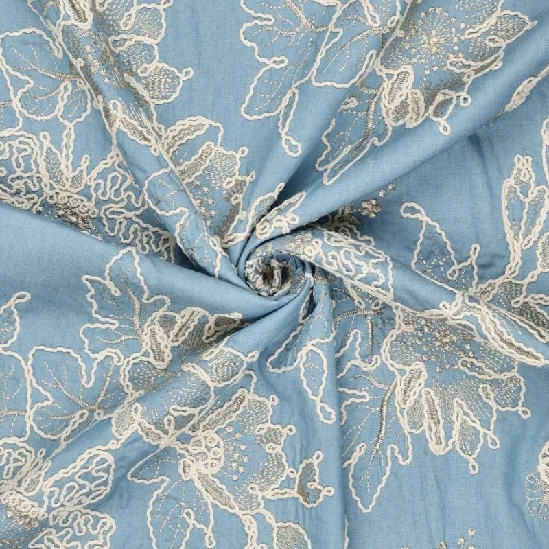 Brodeerattu kevyt denim puuvillakangas, jossa luonnonvalkoisella langalla kirjailtuja kukka- ja lehtikuvioita. Kangas sopii esimerkiksi paitoihin, paitamekkoihin, bombereihin, jakkuihin jne.
